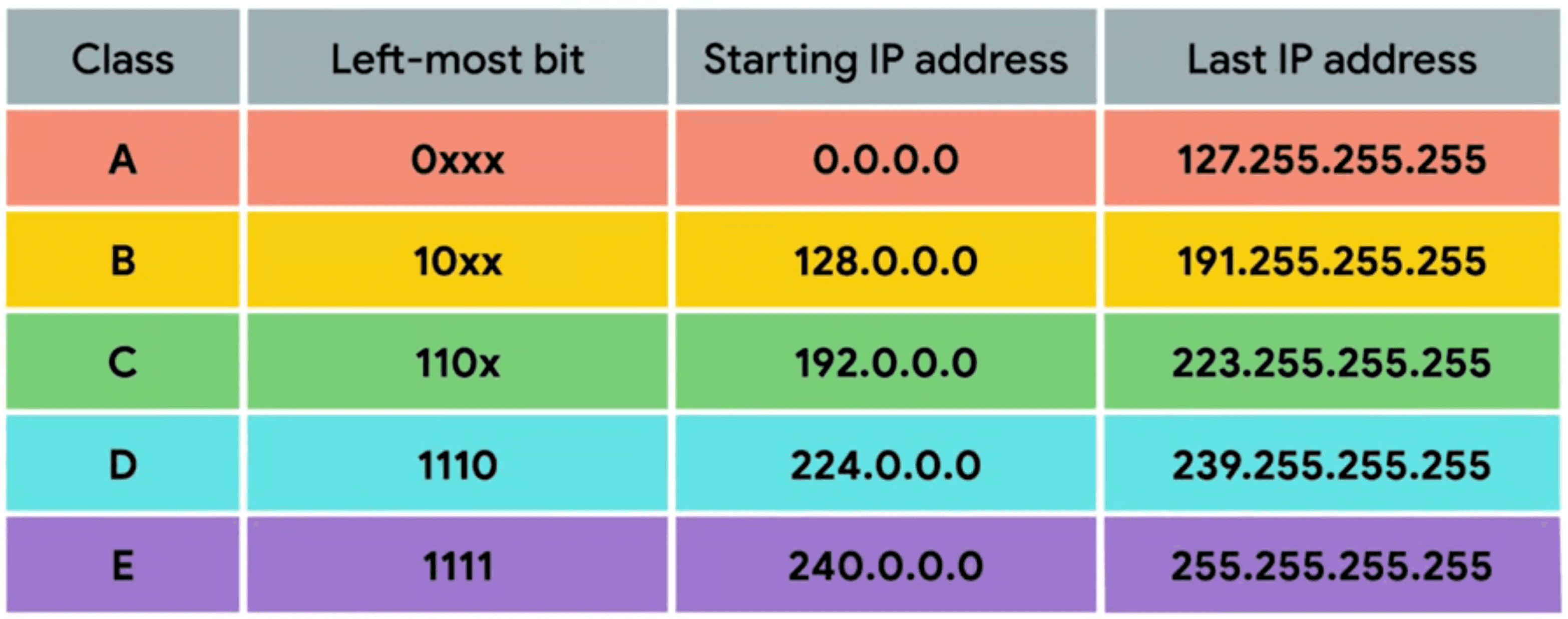 - Classes D and E are reserved for multicast and experimental purposes respectively.
