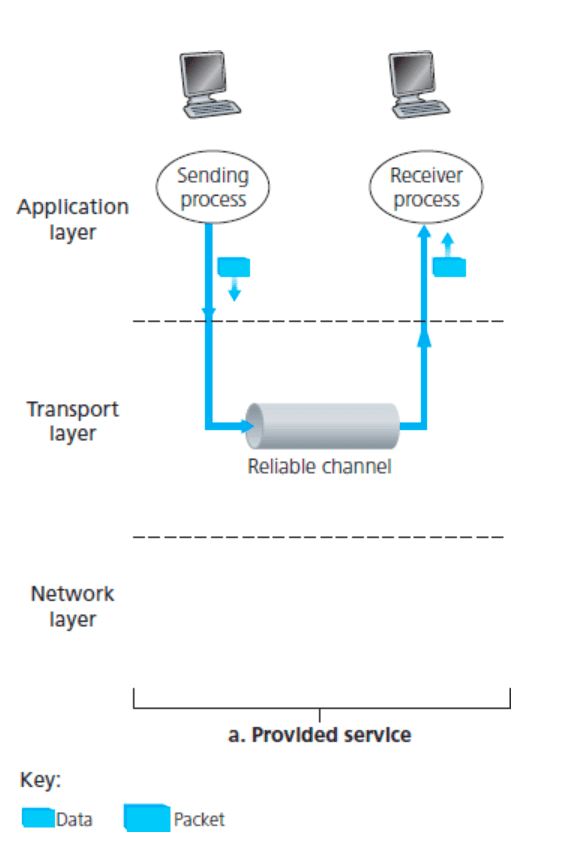 - The service abstraction provided to the upper-layer entities is a reliable channel through which the transport layer can transfer data. With a reliable channel, no transferred data bits are corrupted (flipped from 0 to 1, or vice versa) or lost, and all are delivered in the order in which the transport layer protocol sent them. It is precisely the service model offered by TCP to the Internet applications that invoke it.