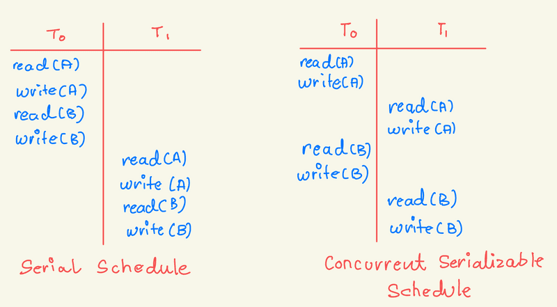 Consider a system with two data items, A and B, and two transactions, T0 and T1. If executed atomically in sequence, this is called a serial schedule, ensuring conflict serializability.